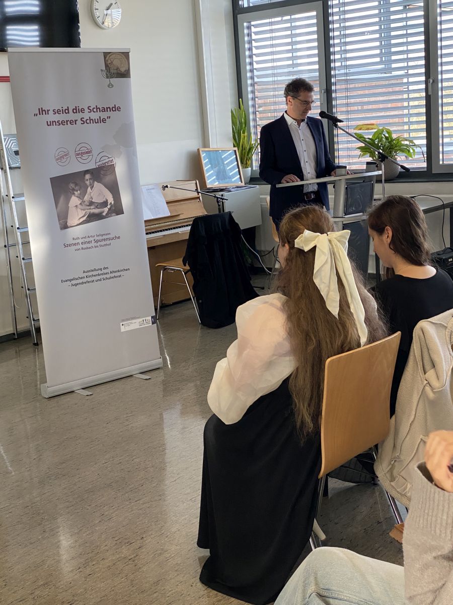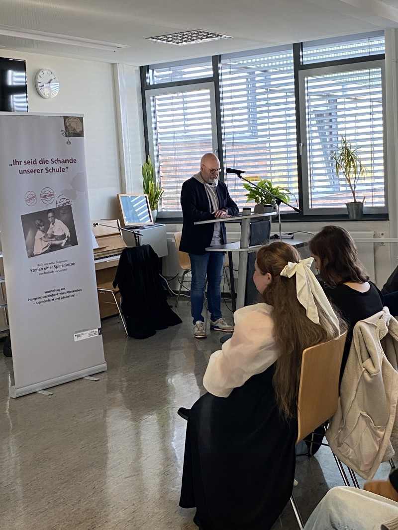 Schulpfarrer Stefan Turk hob in seiner Ansprache die Intention der Ausstellung hervor, junge Menschen zum Nachdenken über Ausgrenzung und Verantwortung anzuregen. Pfarrer und Religionslehrer Jochen Remy aus Herzogenrath ging in seinem Beitrag den Ursachen des Antisemitismus nach, während Schulreferent Pfarrer Dr. Kai Horstmann die Bedeutung von Zivilcourage und Demokratiebildung betonte.