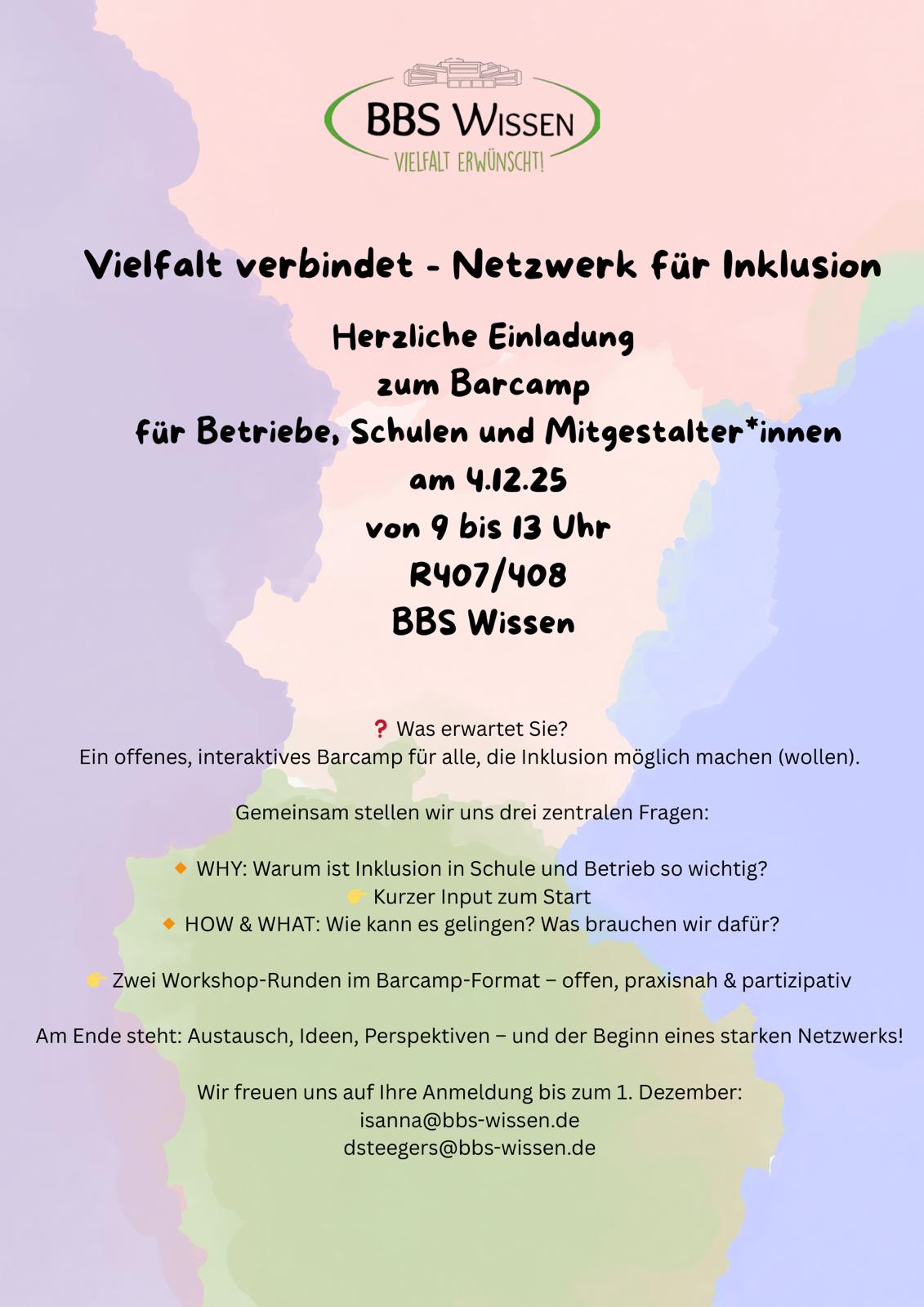 Das Format Barcamp bietet dafür einen besonderen Rahmen: Es gibt keine klassischen Vorträge, sondern Teilgebende, die sich mit Fragen und Ideen einbringen. In 2 Sessions werden diese bearbeitet. Diese Auftaktveranstaltung bot einen strukturierten Rahmen, in dem intensiv gearbeitet wurde. So kann unser Netzwerk weiter wachsen und Inklusion in Schule und Übergang Schule - Beruf kontinuierlich und aktiv entwickelt werden.