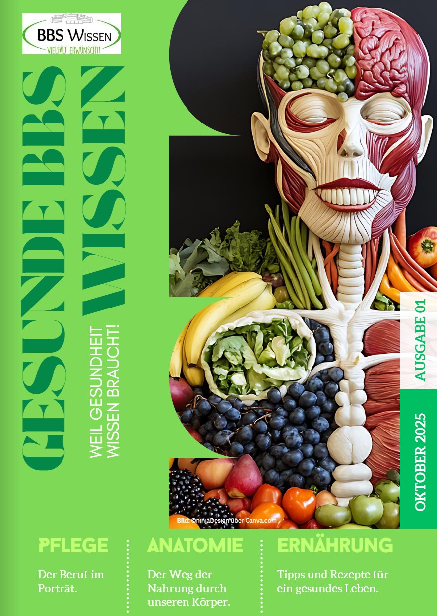 Unsere Referendarin Frau Alexandra Hoffmann hat gemeinsam mit ihrer Klasse der Berufsfachschule Pflege (BFPF25, generalistische Pflegeausbildung) ein besonderes Projekt ins Leben gerufen: „Gesunde BBS Wissen – weil Gesundheit Wissen braucht“ lautet der Titel der digitalen und interaktiven Gesundheitszeitschrift, in der die Schülerinnen und Schüler zusammen mit Frau Hoffmann über verschiedene Themen aus den Bereichen Gesundheit, Pflege, Anatomie und Ernährung berichten.